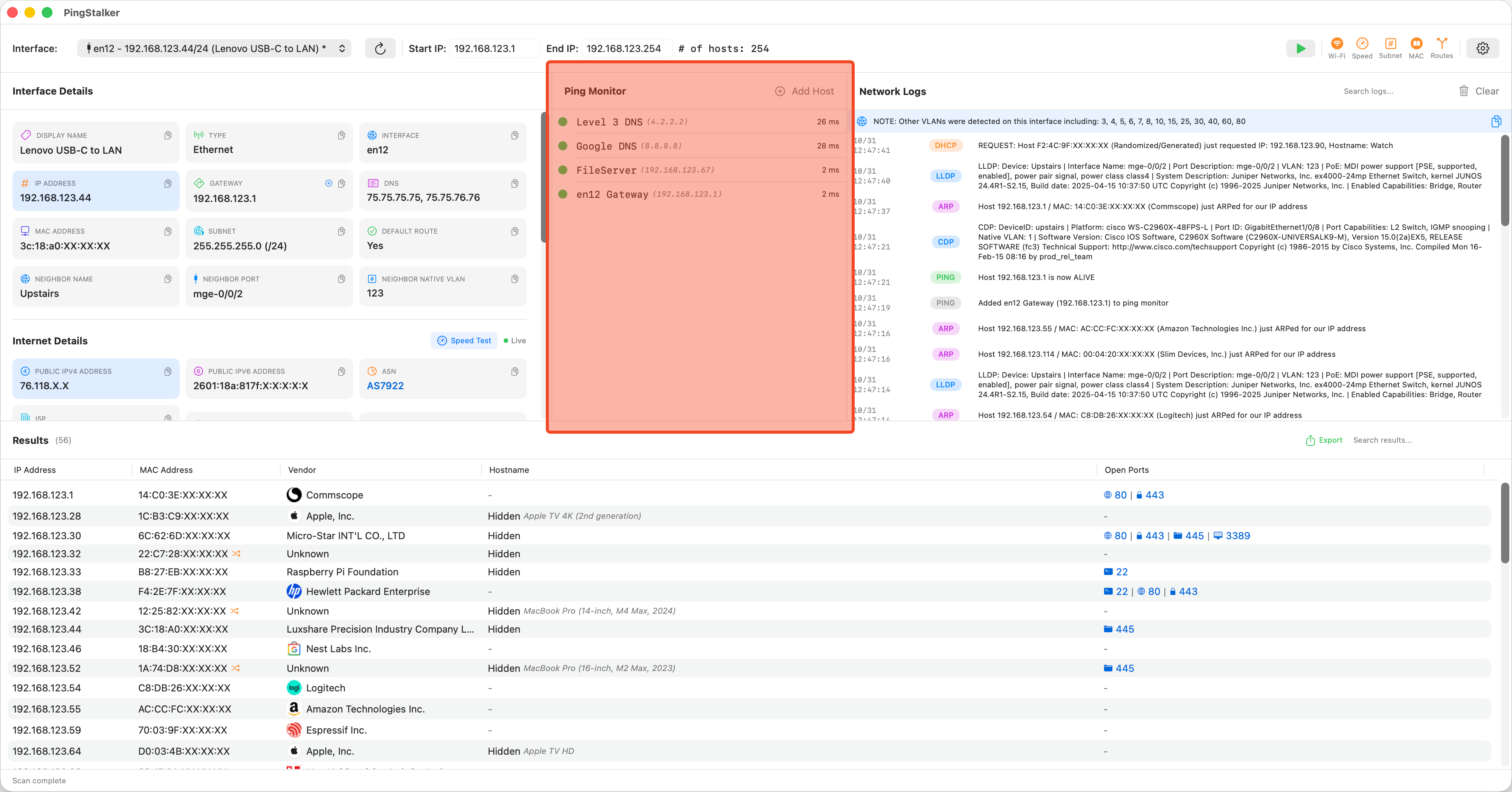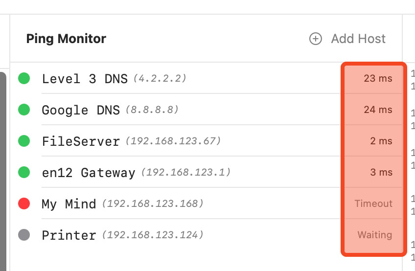 The Ping Monitor provides continuous monitoring of critical hosts with real-time status updates and latency tracking. Located in the center pane of the main window, it allows you to track the availability of important network resources at a glance.