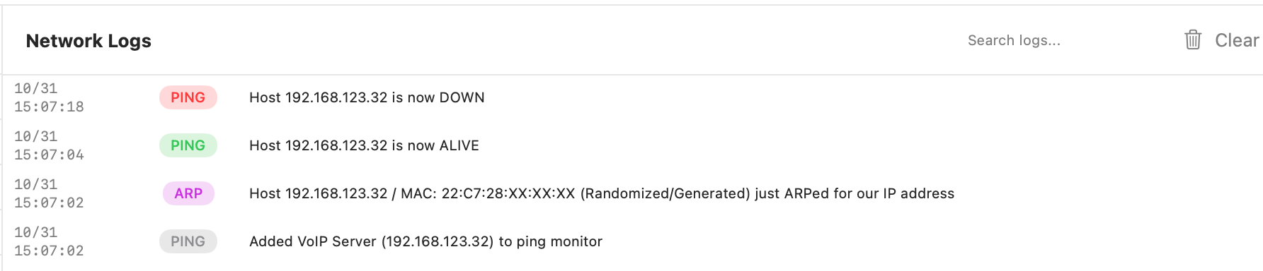 Host Goes Down: - macOS notification appears: "Host [IP/Label] is down" - Red status indicator in Ping Monitor - Event logged to Network Logs