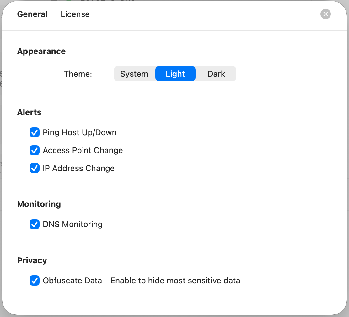 The Settings window provides essential configuration for customizing NetViews to your needs. Review each tab and configure alerts, monitoring, and privacy to match your usage patterns. See Registration for detailed licensing information.
