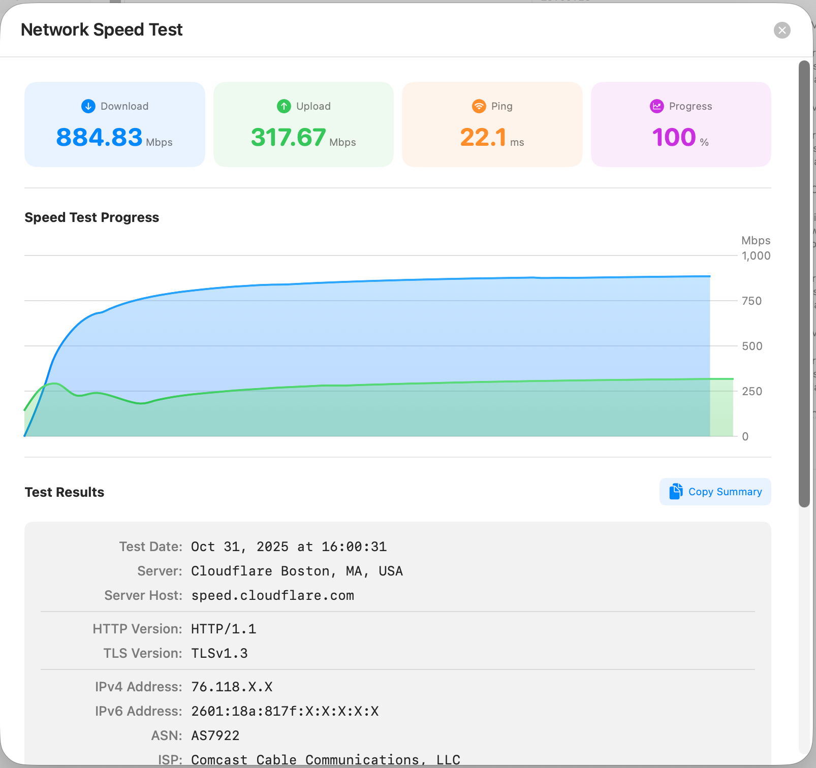 The Speed Test feature measures your internet connection performance using Cloudflare's global CDN network. It provides comprehensive metrics including download/upload speeds, latency, jitter, and detailed connection information.