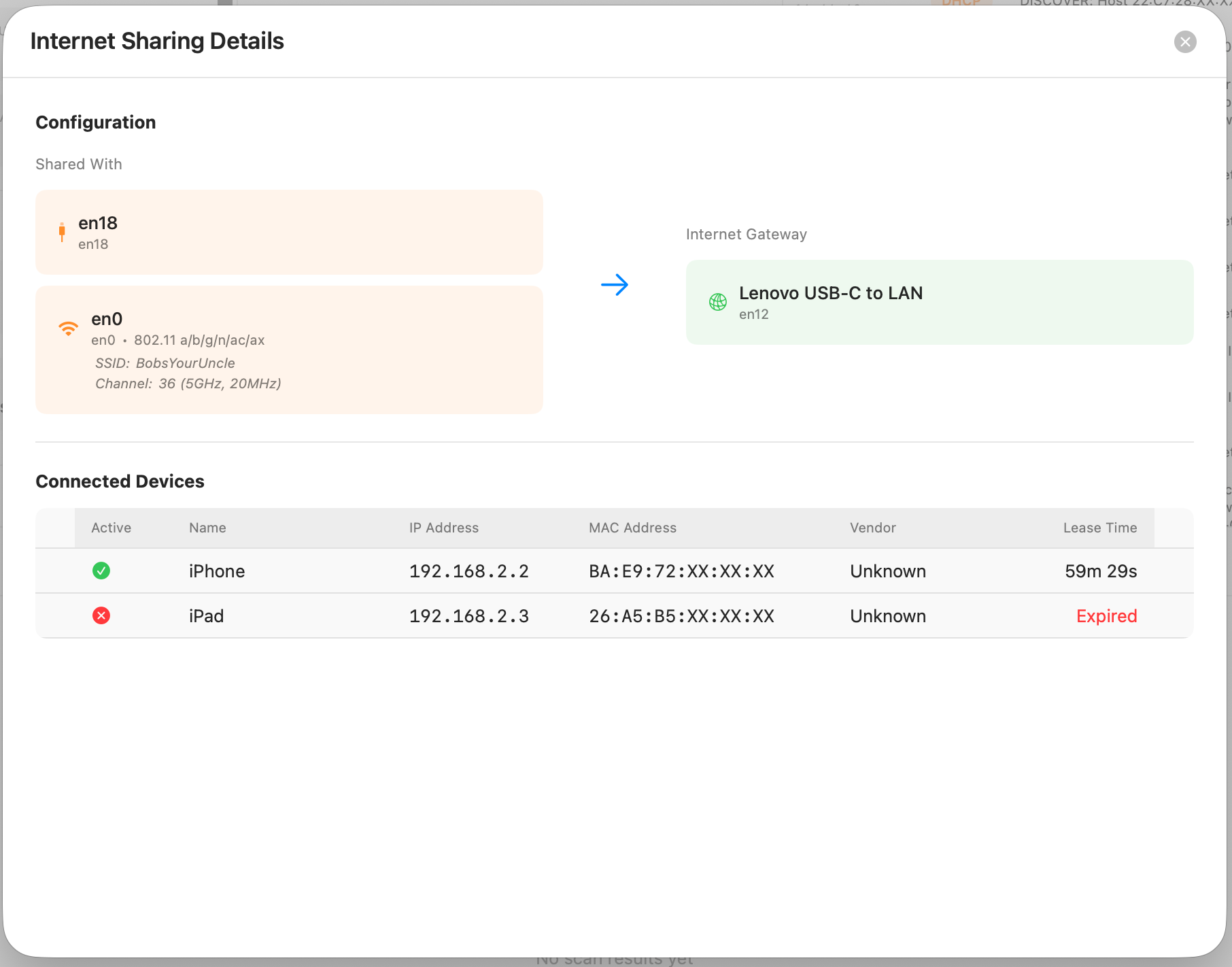 The Internet Sharing Details window provides monitoring and management of macOS Internet Sharing, showing connected devices and their DHCP lease information.