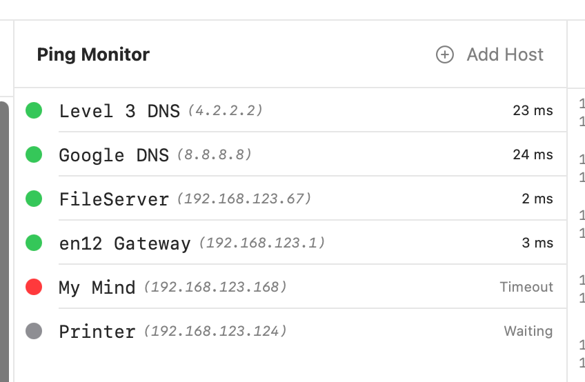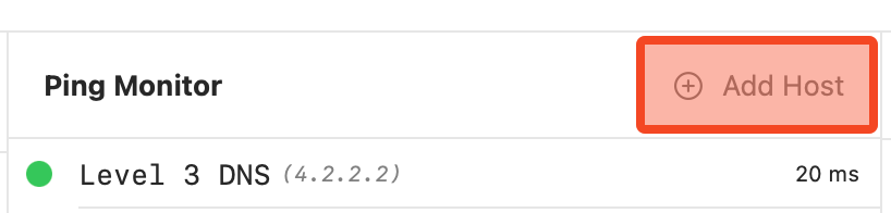 The Ping Monitor provides continuous monitoring of critical hosts with real-time status updates and latency tracking. Located in the center pane of the main window, it allows you to track the availability of important network resources at a glance.