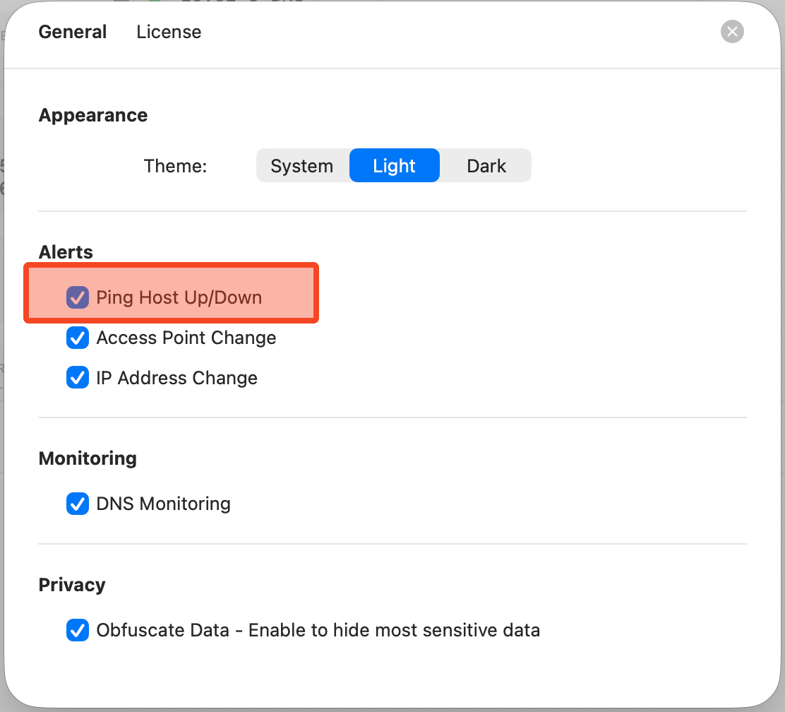 Host Goes Down: - macOS notification appears: "Host [IP/Label] is down" - Red status indicator in Ping Monitor - Event logged to Network Logs